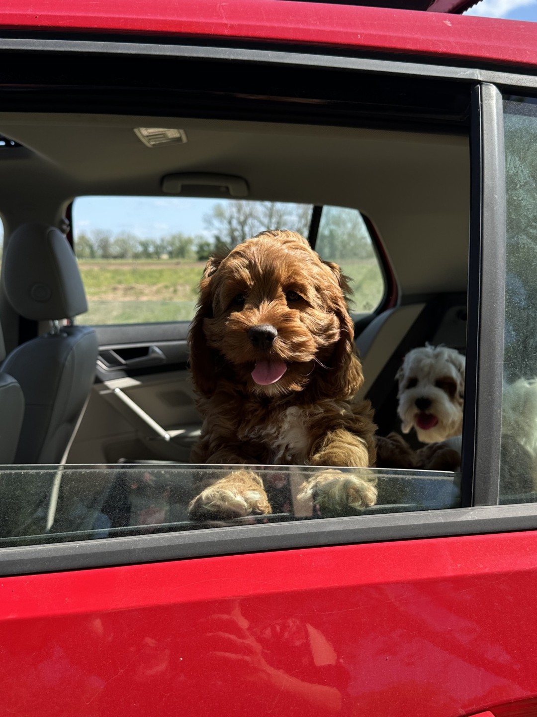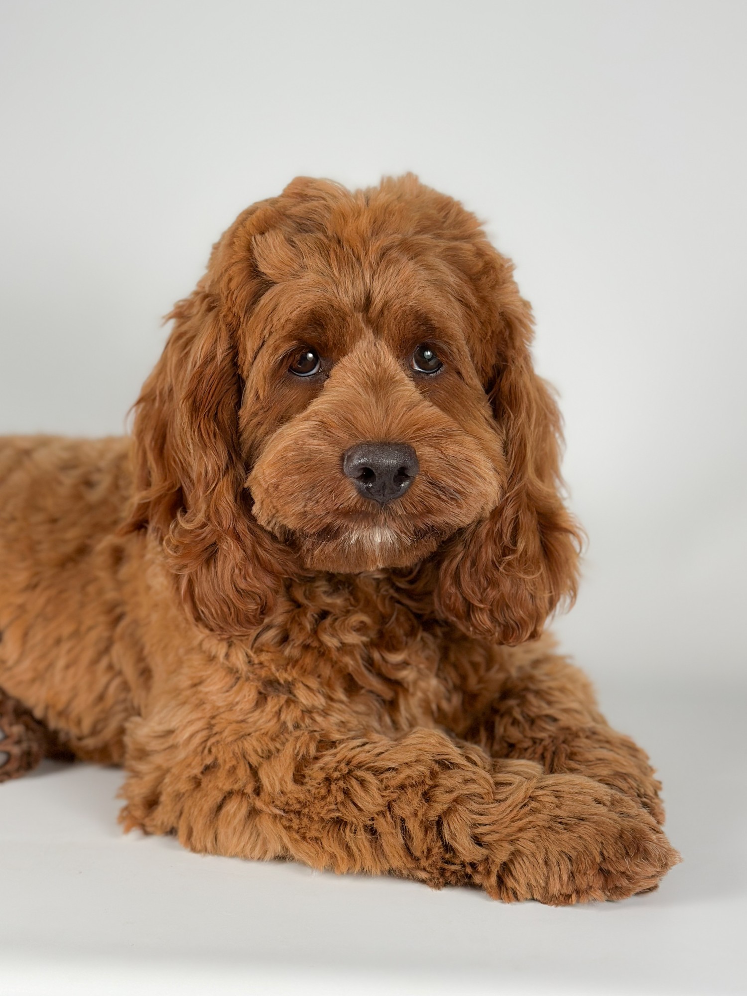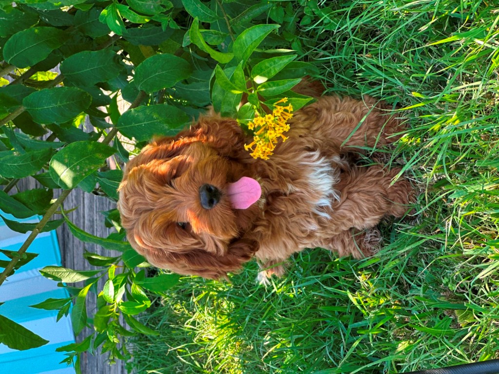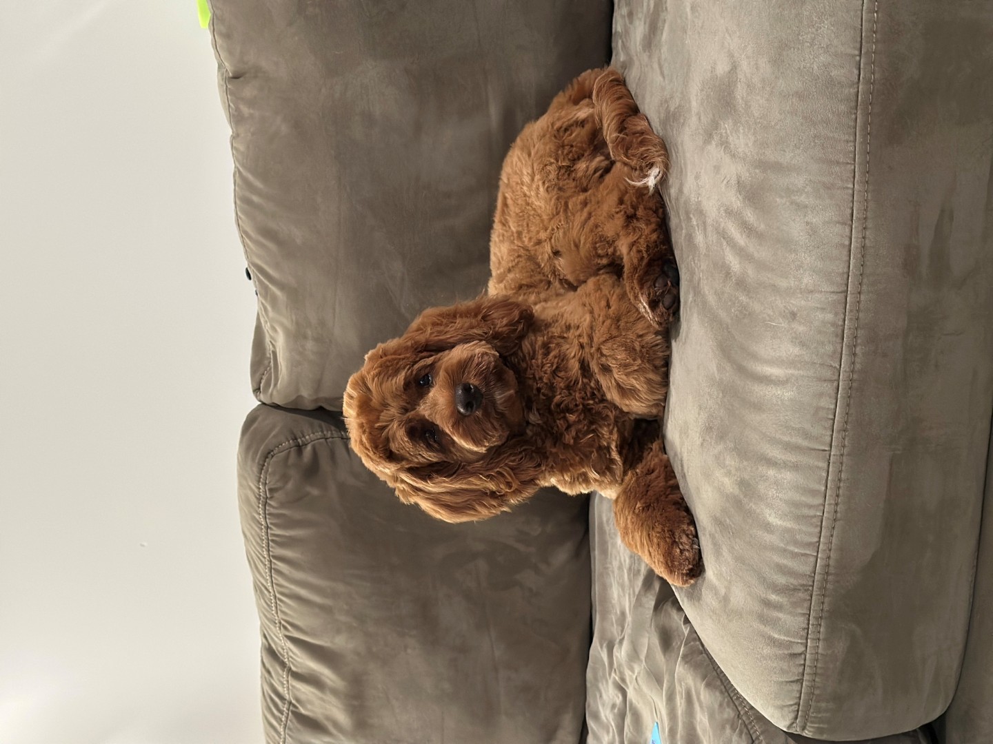 Prim is a stunning solid red Cockapoo with a soft, wavy, non-shedding coat. She’s an absolute cuddlebug—her favorite place is right next to you, whether that’s on the couch or curled up in bed. Prim is 6½ months old and weighs 15 lbs 8 oz, so we estimate her adult weight to be around 18–20 lbs.