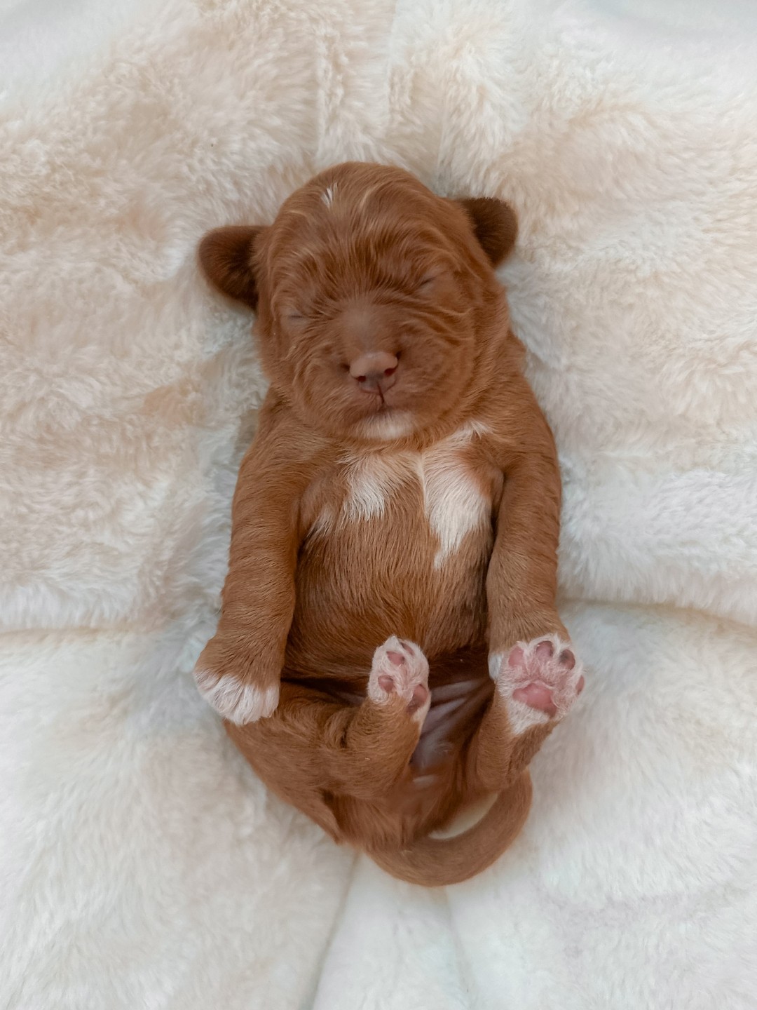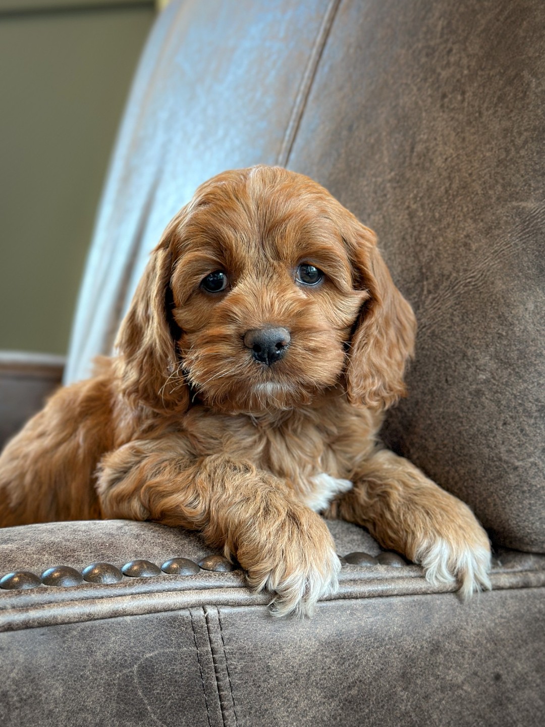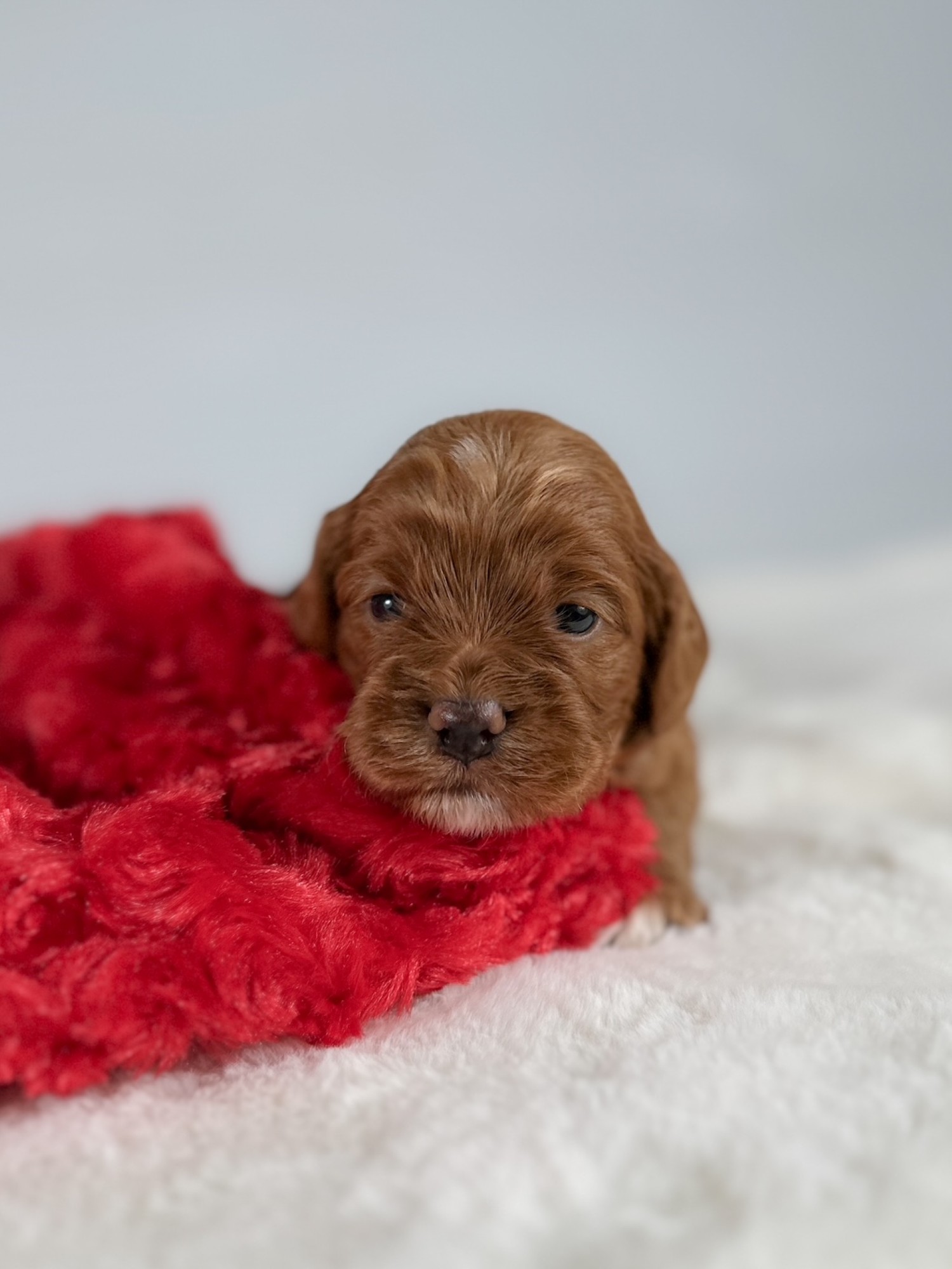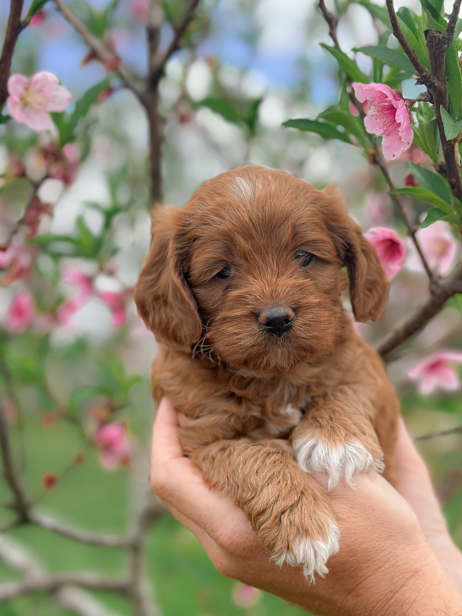 Prim is a stunning solid red Cockapoo with a soft, wavy, non-shedding coat. She’s an absolute cuddlebug—her favorite place is right next to you, whether that’s on the couch or curled up in bed. Prim is 6½ months old and weighs 15 lbs 8 oz, so we estimate her adult weight to be around 18–20 lbs.